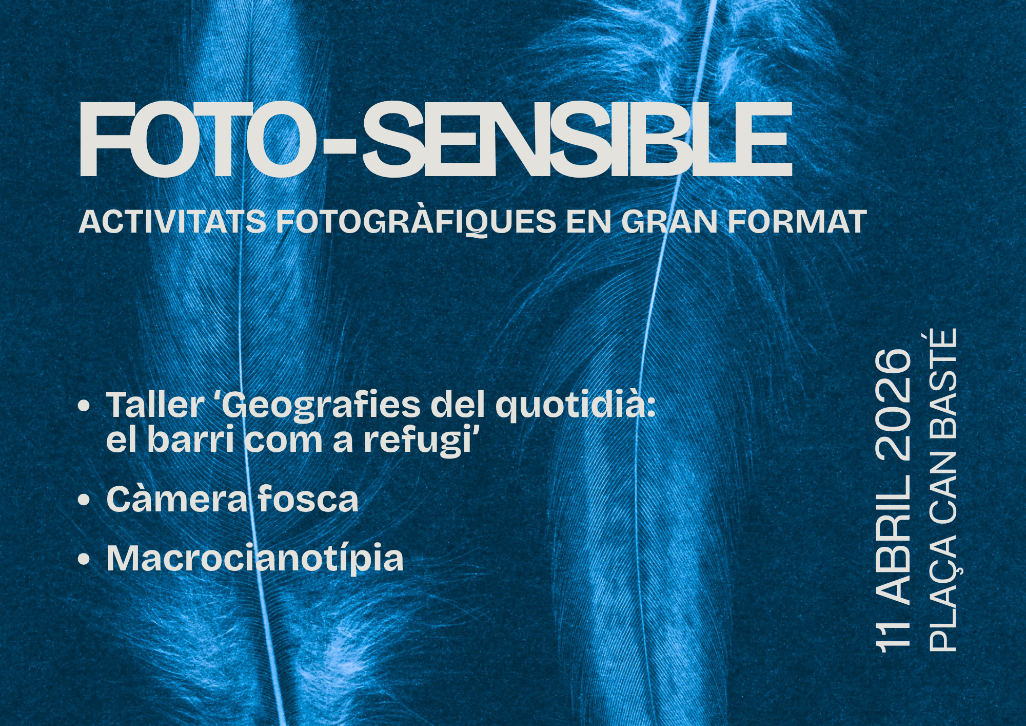 - I a les 12 h…Macrocianotípia.En aquesta activitat formarem part d’una cianotípia de gran format, experimentant amb la llum del sol, el nostre cos i la composició donarem forma a una imatge col·lectiva. El procés ens convidarà a observar, col·laborar i sorprendre’ns amb la màgia d’aquesta tècnica fotogràfica artesanal, on cada resultat és únic.
