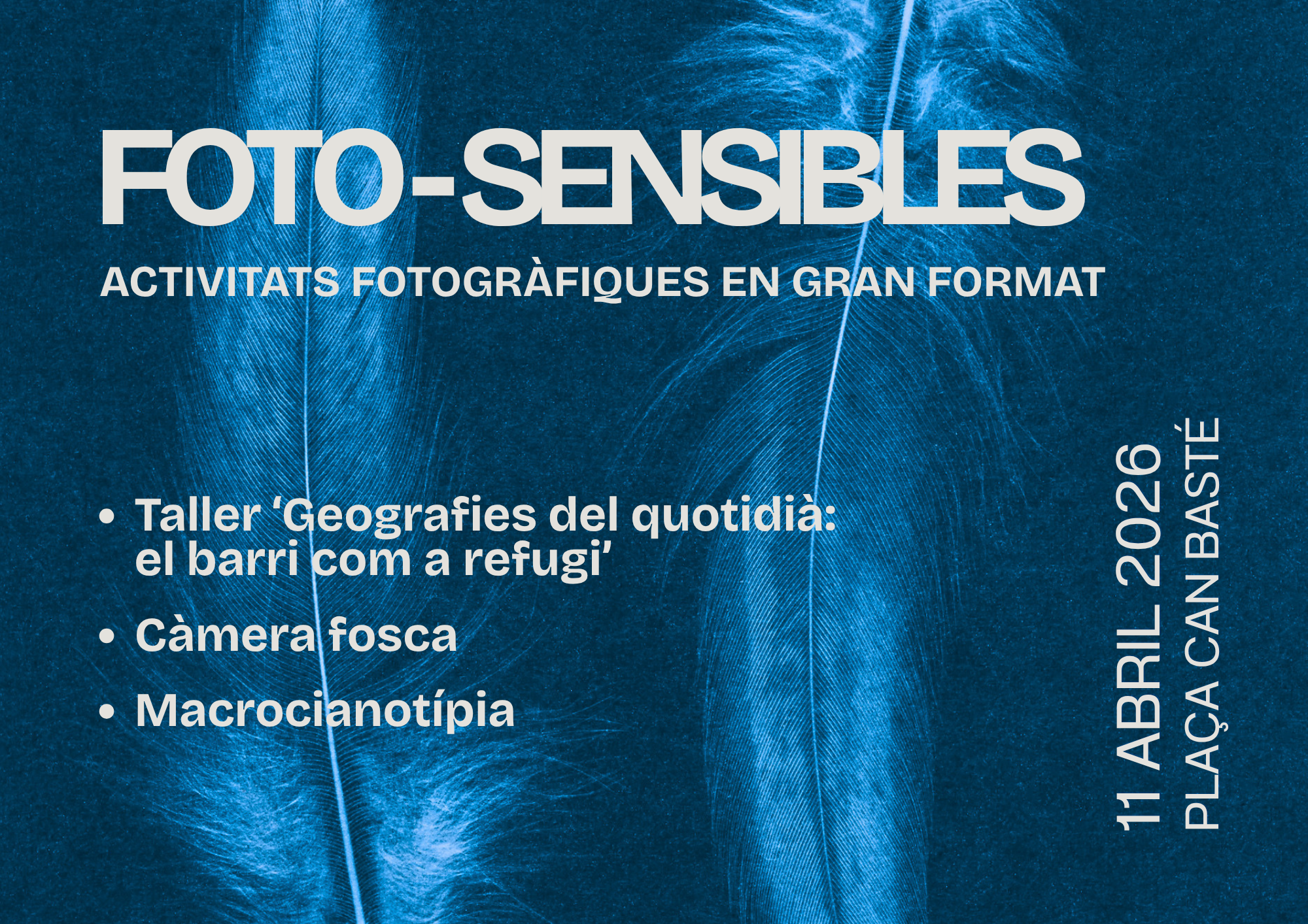 - I a les 13 h…Macrocianotípia. En aquesta activitat formarem part d’una cianotípia de gran format, experimentant amb la llum del sol, el nostre cos i la composició donarem forma a una imatge col·lectiva. El procés ens convidarà a observar, col·laborar i sorprendre’ns amb la màgia d’aquesta tècnica fotogràfica artesanal, on cada resultat és únic.